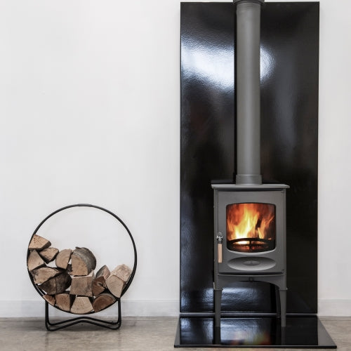 When installed the shield reduces the stoves distance to the face of the panel to just 95mm. VLAZE vitreous enamel panels feature a unique dual skin that provides extra thermal protection and an effective convection system that distributes heat back into the room.